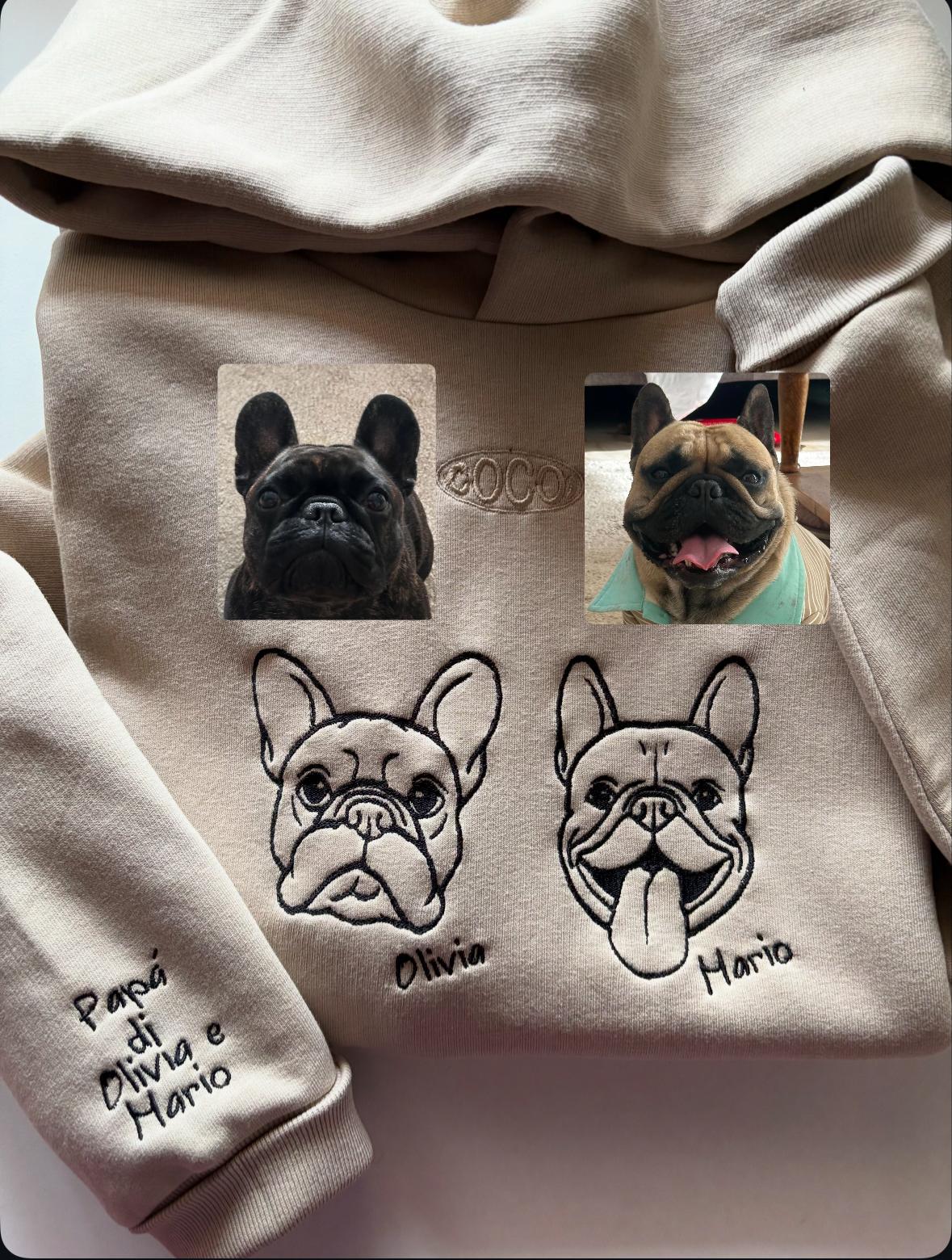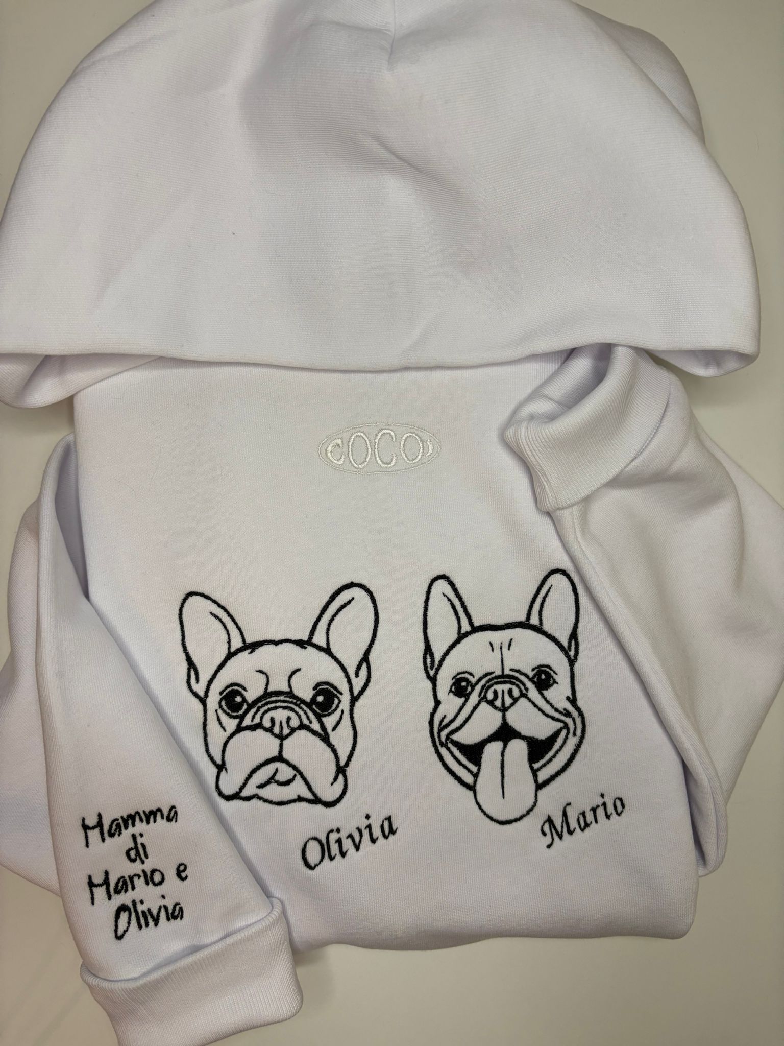Una felpa fatta solo per te. Carica la tua foto → la trasformiamo in line art minimalista → ricamata in filo nero o bianco. Senza riempimento, solo linee pulite per un effetto senza tempo.